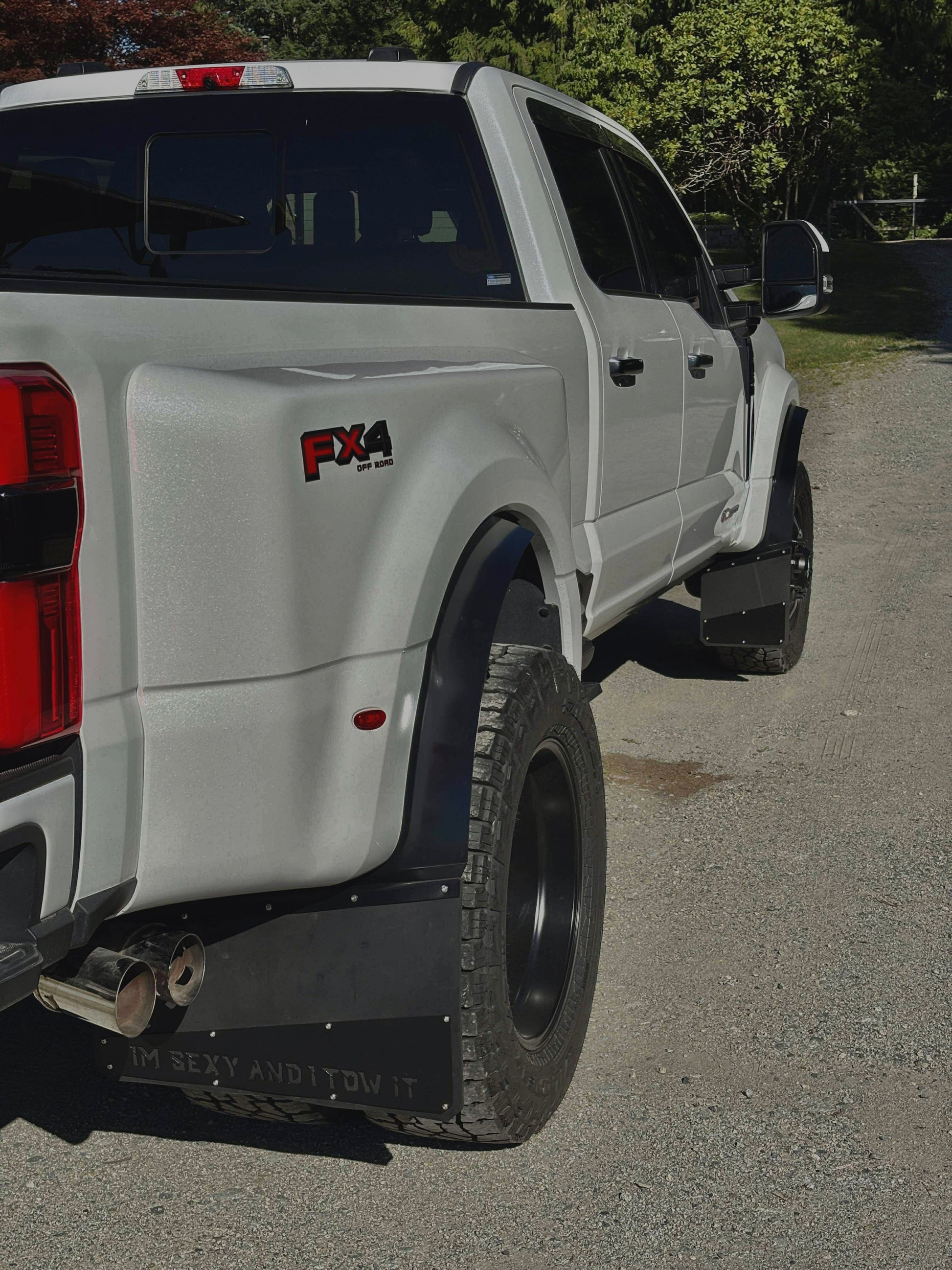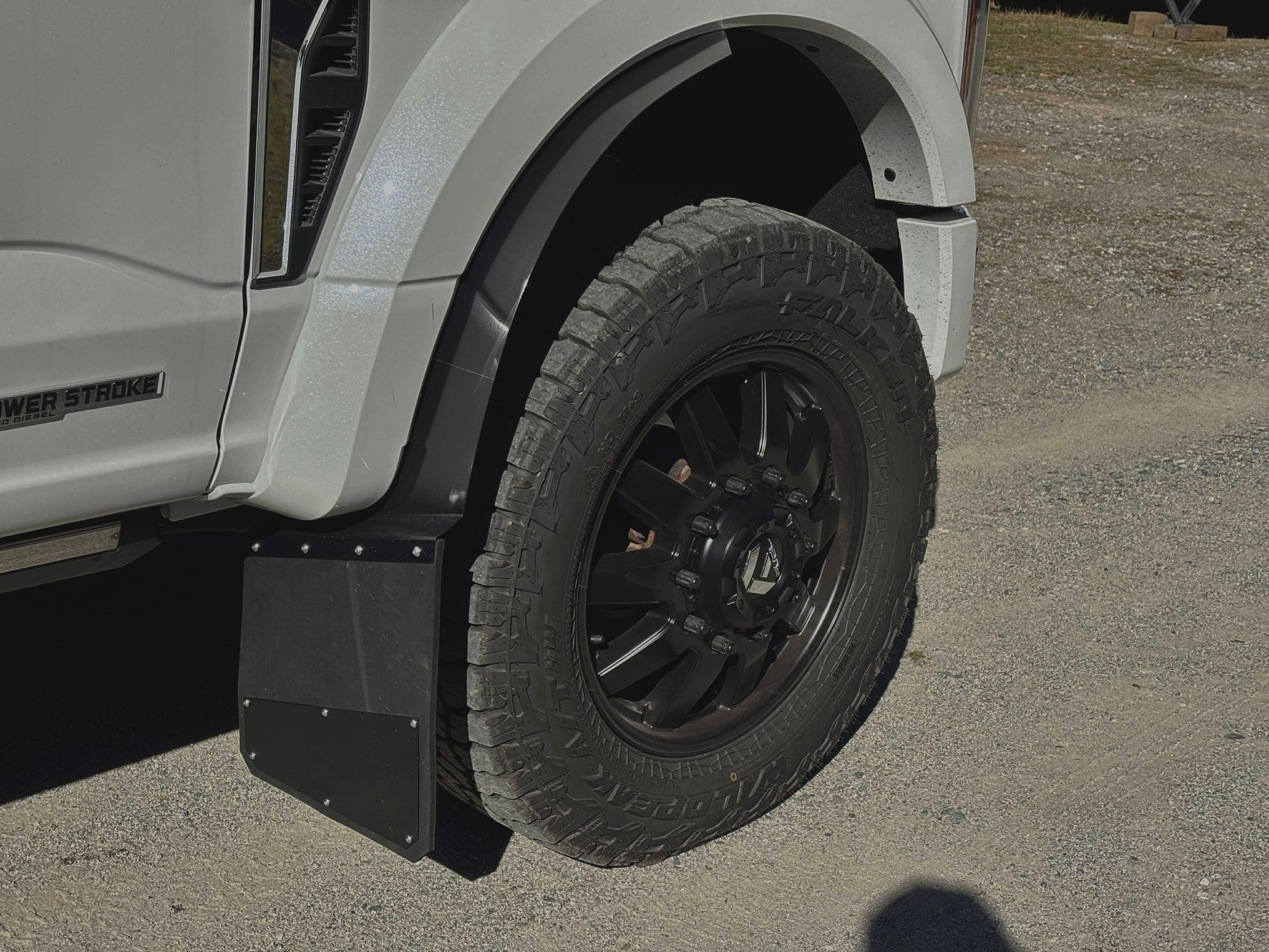Longjohn Dually set of 4 mudflaps! Sick of your paint getting damaged by dirt, rocks, and road debris? Tired of your truck being filthy after driving 5 minutes in the rain or getting pulled over for tire poke? If so then a set of kickback mudflaps are ideal for you and your build. The kickbacks are cnc plasma cut for precision and made of aluminum to keep them lightweight with 3/8 rubber at the bottom. Dually sets available with 10” or 12” fronts, and 22” or 24” rears.